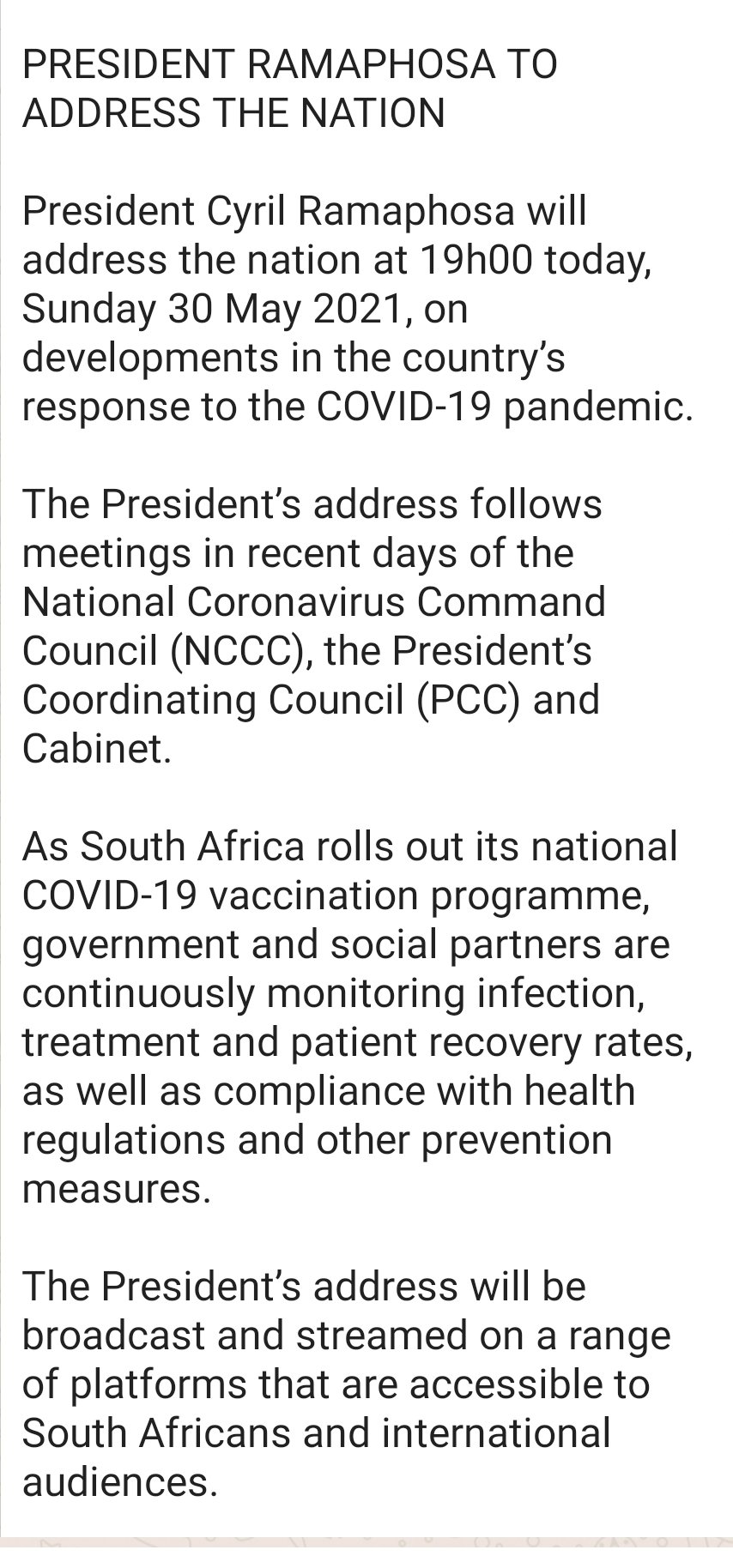 President Address 30 May 2021 : Ramaphosa To Address The Nation Ukbhe0s8ktnt2m Jun 15 2021 The President Will Address The Nation At 8pm Following A Meeting With The National Coronavirus Command Council _ Chinese president xi jinping attended the global health summit and delivered a speech via video link in beijing on friday.. It's very difficult to see through the smokescreen and form a balanced opinion. In his speech, xi urged the international community to put the people and. Former president jacob zuma addressed the members of the media outside his nkandla home on sunday evening. 30 may 2021 8:36 pm. Our current affairs may 2021 events will help you to get more marks in banking, insurance, ssc, railways, upsc, clat and all state government about world gastroenterology organisation (wgo):